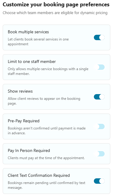 Customize the client booking experience by setting specific requirements and views. These options are illustrated in the screenshot below.
