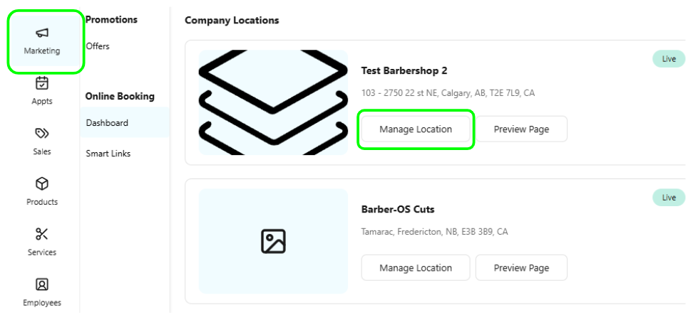 - Navigate to Marketing ➔ Online Dashboard ➔ Manage Location Actions (see screenshot for reference).
