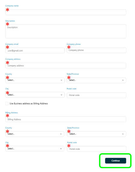 - Fill out the Tell Us About Your Company form — all fields in this section are required.